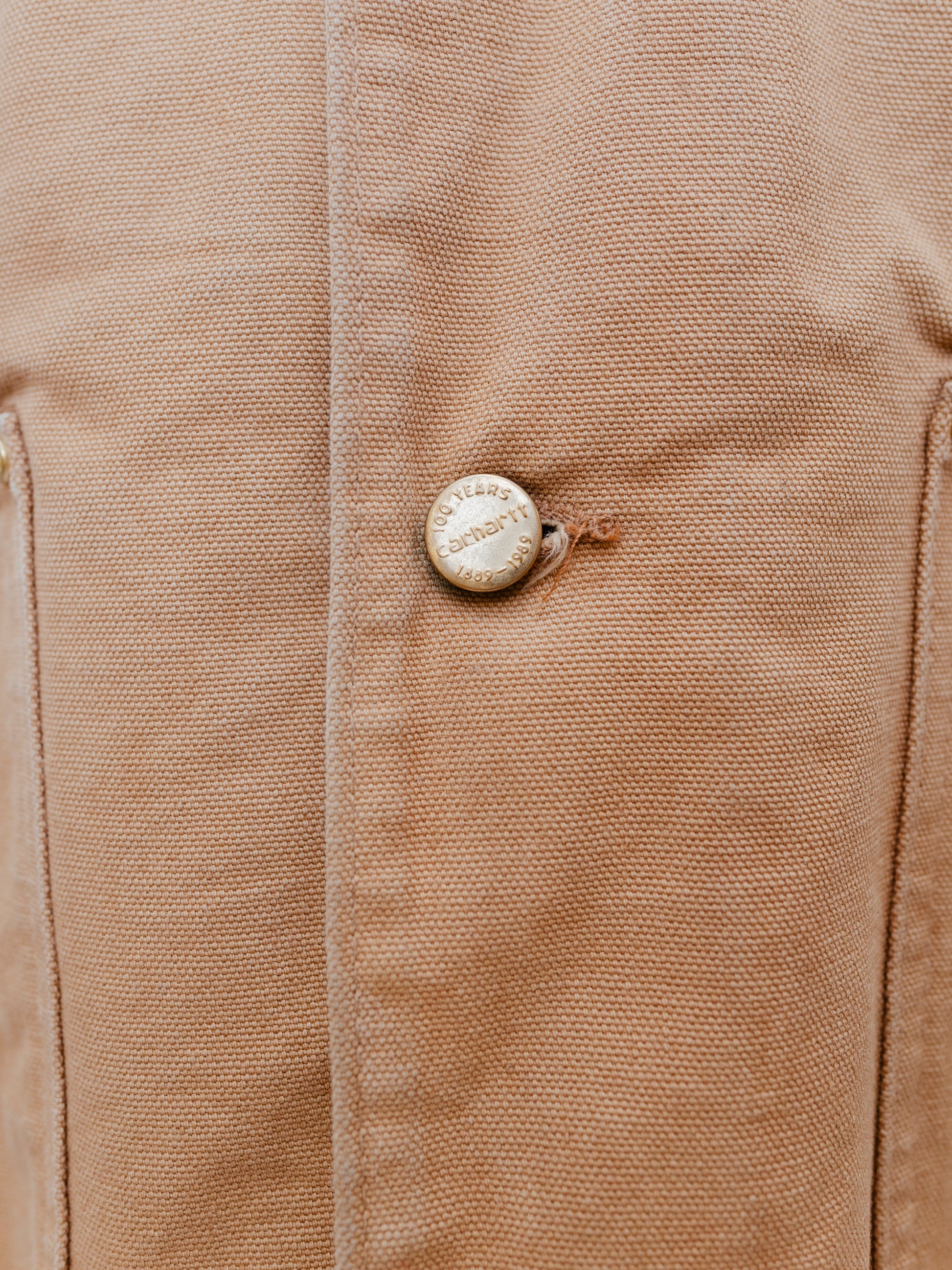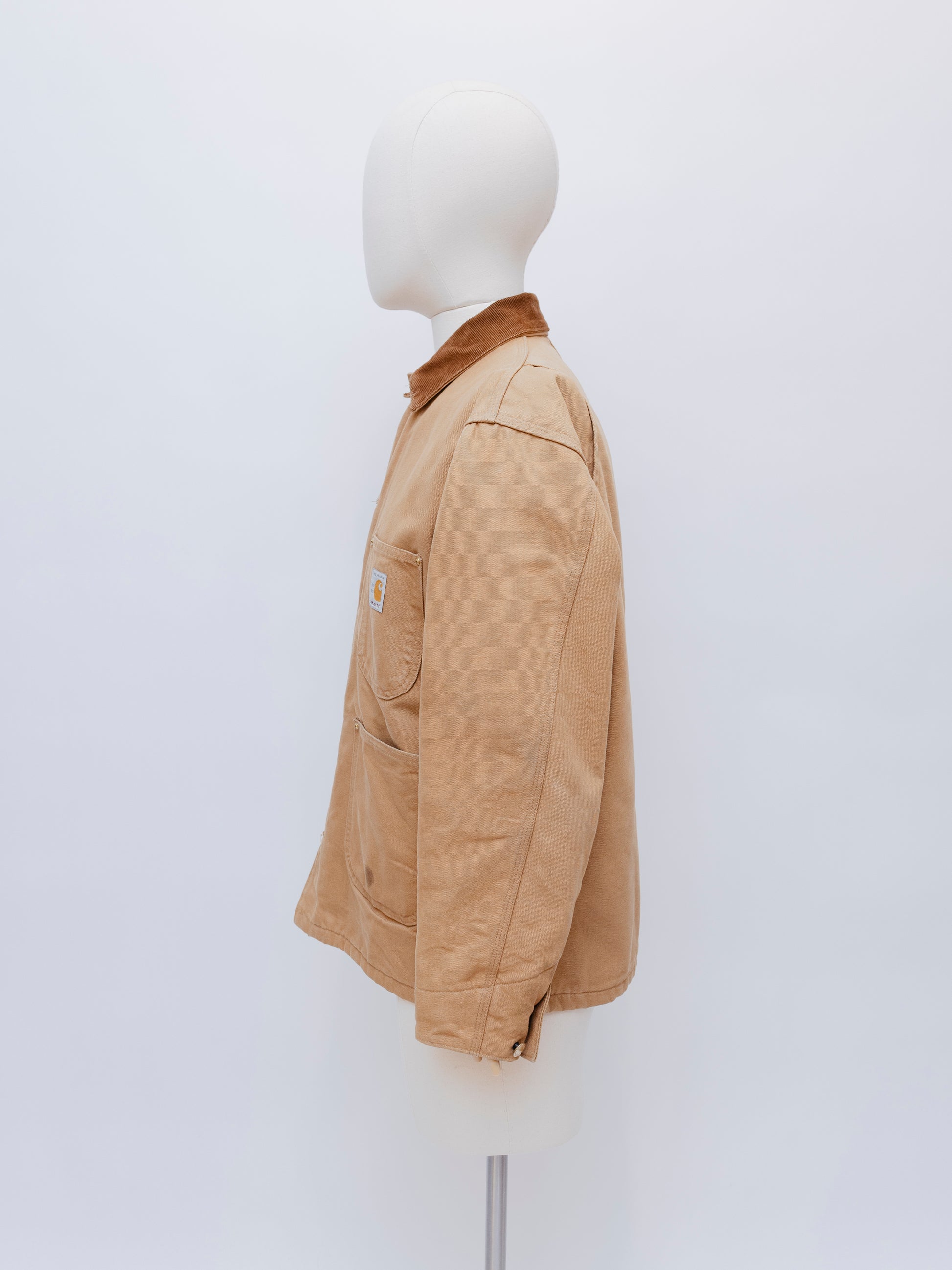 Step into fall with this vintage camel brown Carhartt work jacket, crafted in the USA back in 1989. Its classic rugged style and cozy warmth make it the ultimate companion for crisp autumn days. Whether you're raking leaves or chasing pumpkin patches, this jacket has your back in true vintage fashion.