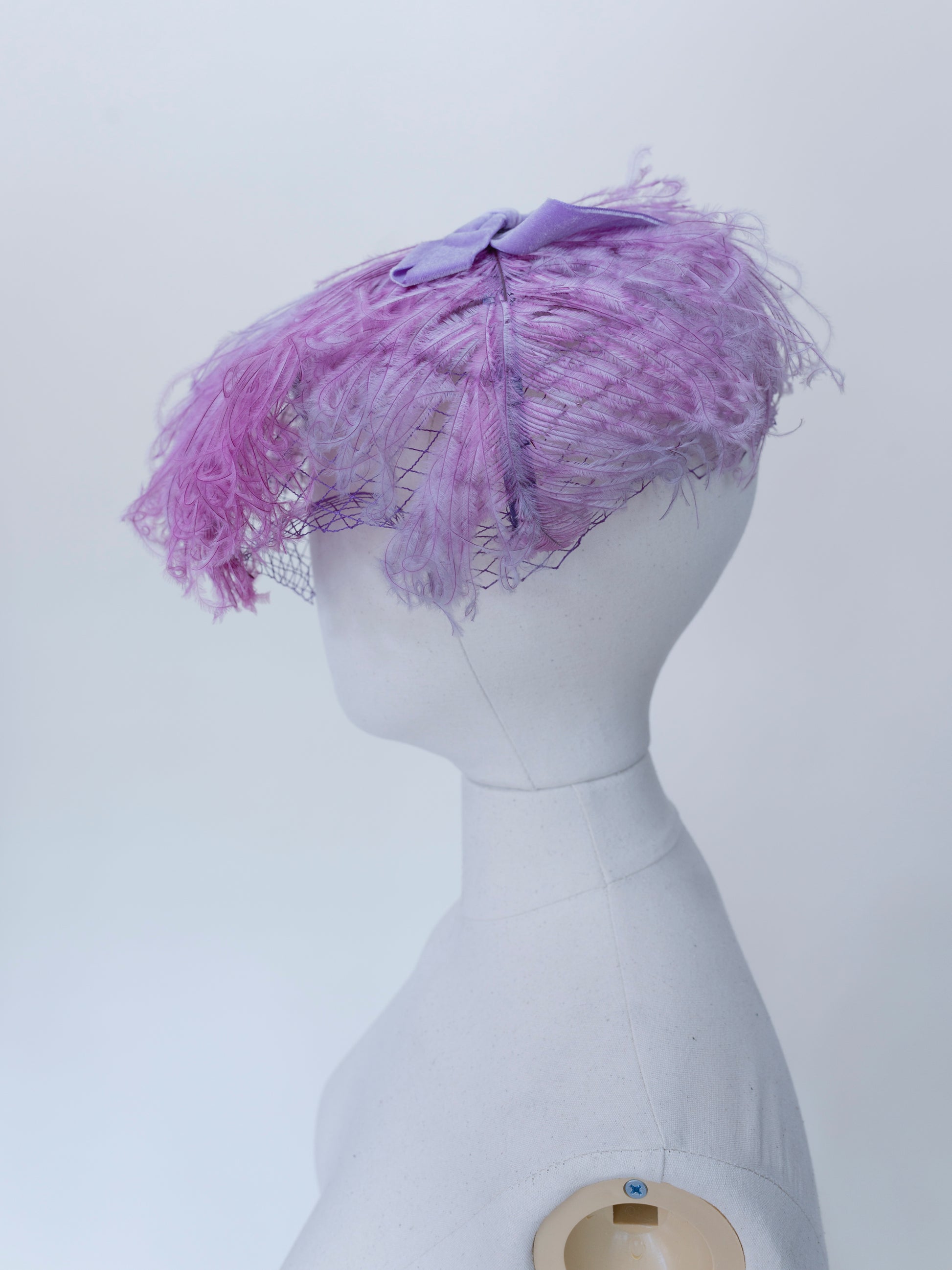 This playful 1940s hat features whimsical nets and vibrant purple dyed feathers for a fun and flirty vintage look.