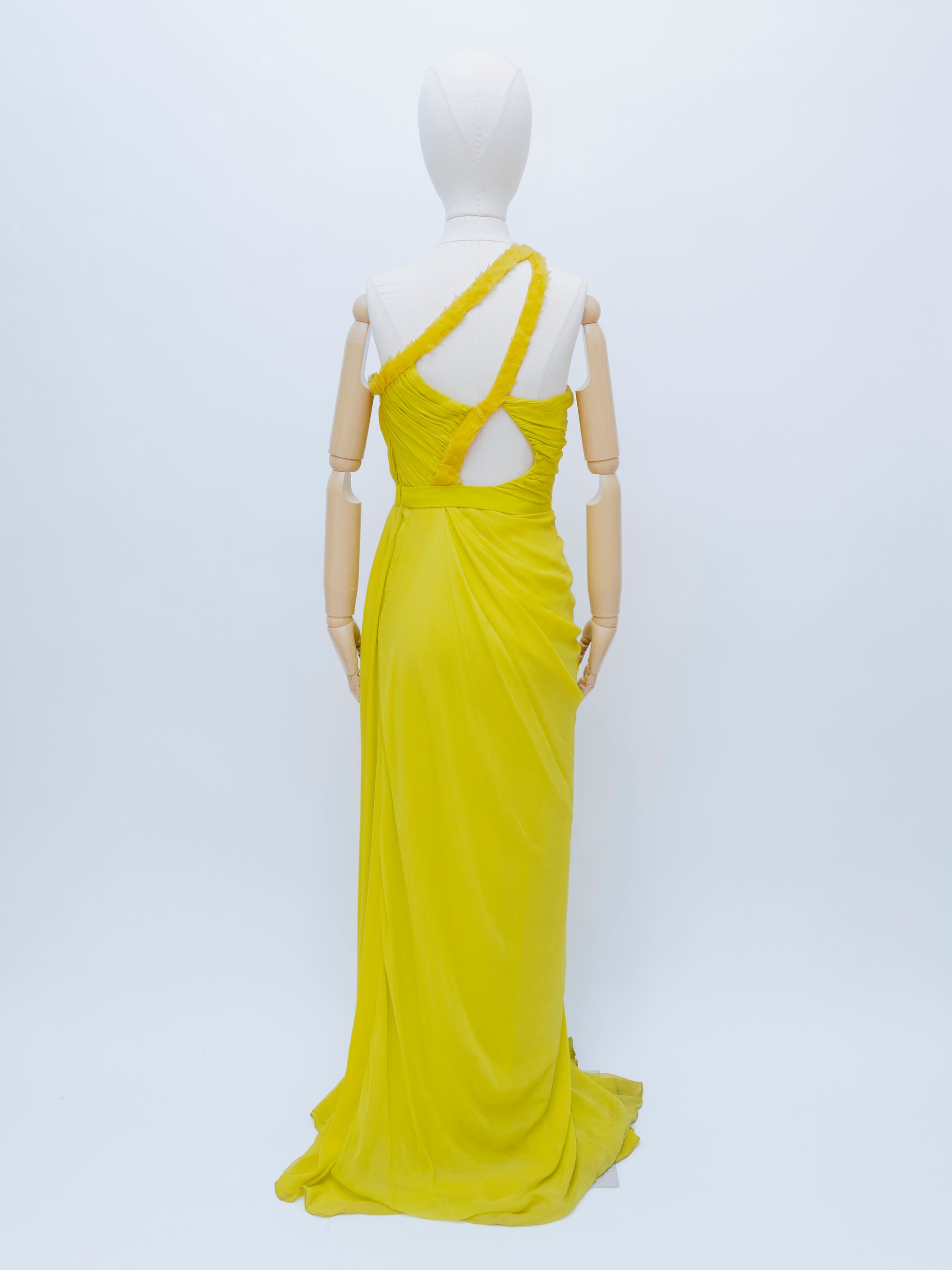 This Chartreuse gown with an angular top design and flowing bottom is a favorite here amongst the Revival Vintage staff. With ruffled lining at the top, and an asymmetrical bottom, the dress has dimension on every level. It is a gown ready for the red carpet, and the color is one of a kind.