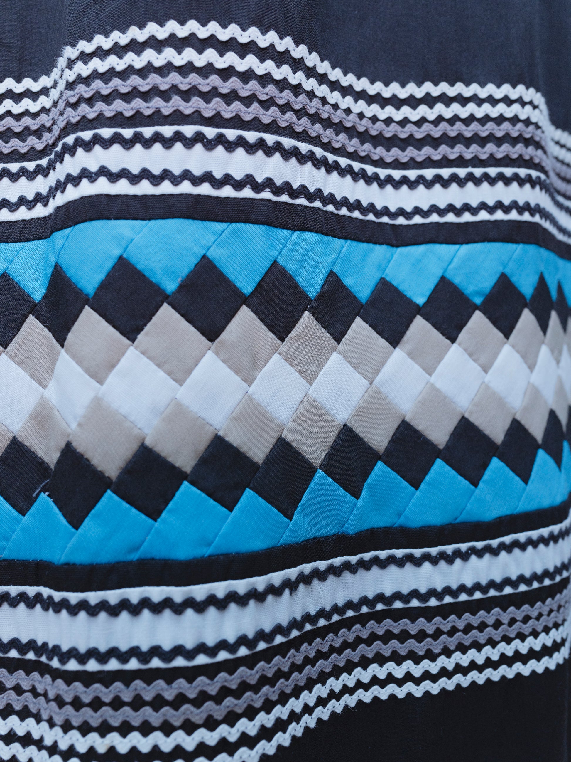 This handmade traditional Seminole skirt is made up of patchwork, an everyday design used in Seminole clothing. This patchwork is key to their identity, and this skirt comes from the Seminole Tribe of Florida.