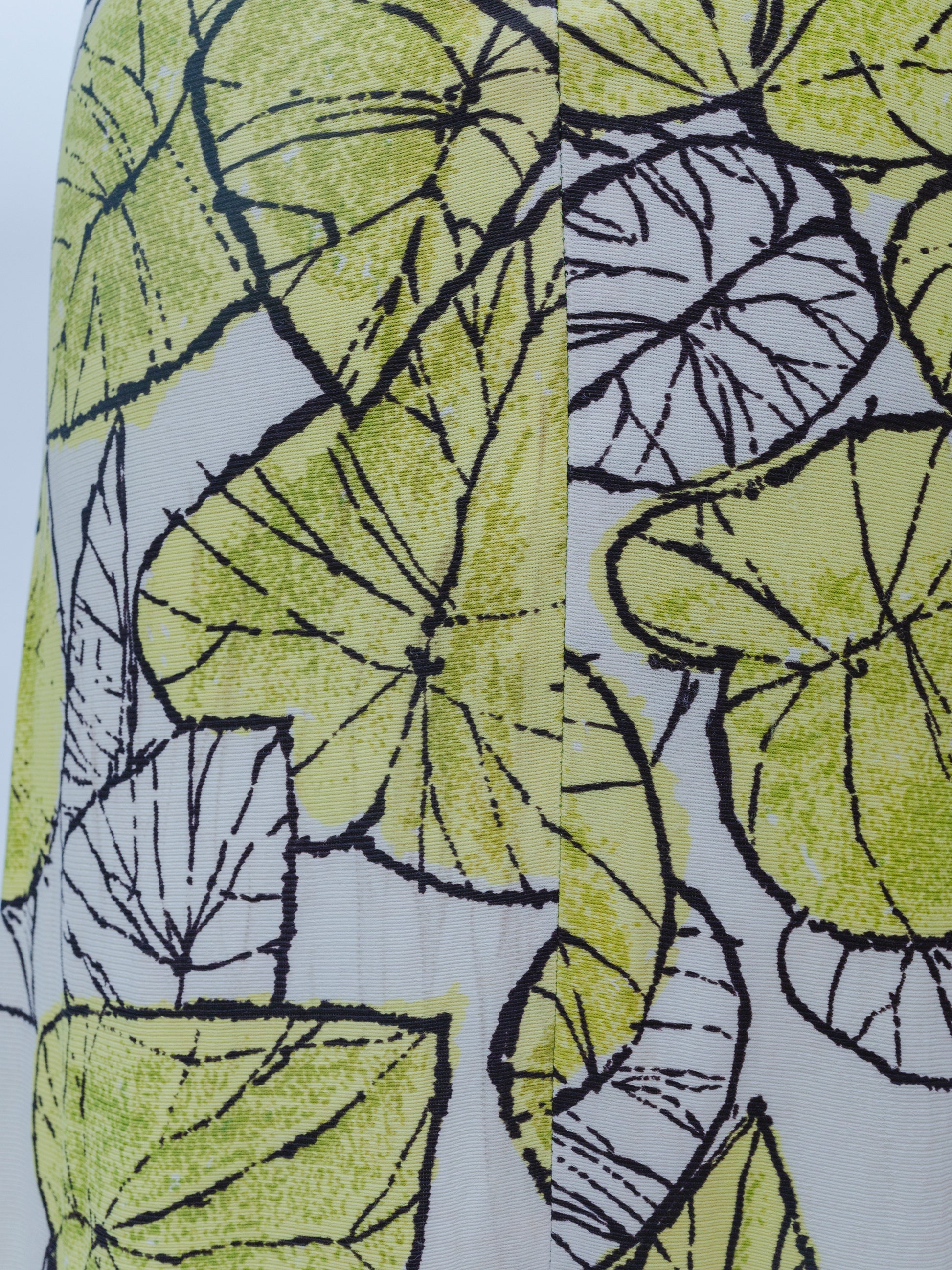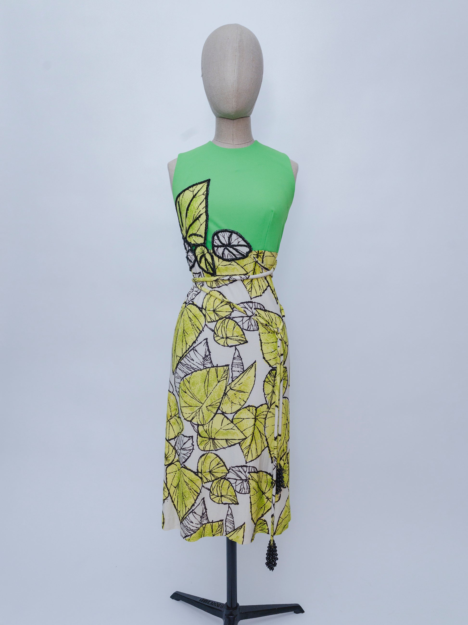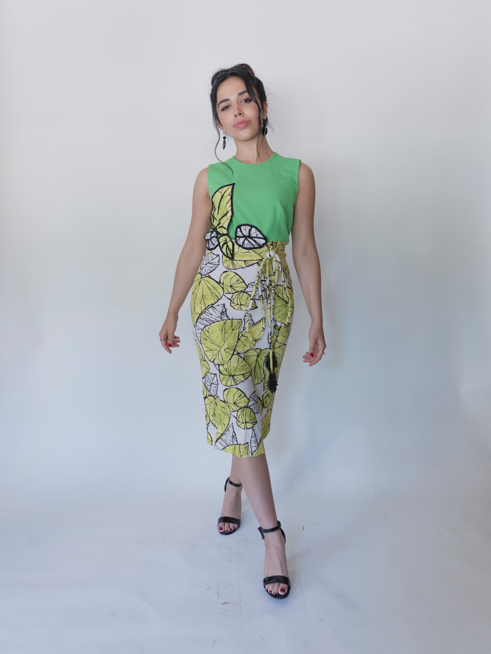 Lemonade? No, thank you. LIMEonade please! This bright dress stands out in every room, and is embellished with elegant beaded detail on the tropical leaves that make its bottom pattern. The beaded tassels that tie at the waist give you an extra sway of confidence when you walk.