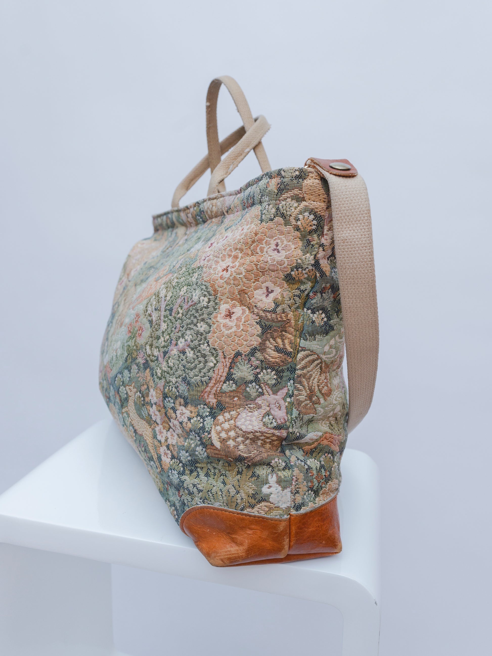 This jungle tapestry tote made in Maine, has leather accents, and is filled with animal and floral designs. It includes dancing deer, and tigers, and bunnies — oh my! Truly stylish and spacious, fit all you need for a weekend getaway, or any of your personal items for a flight!