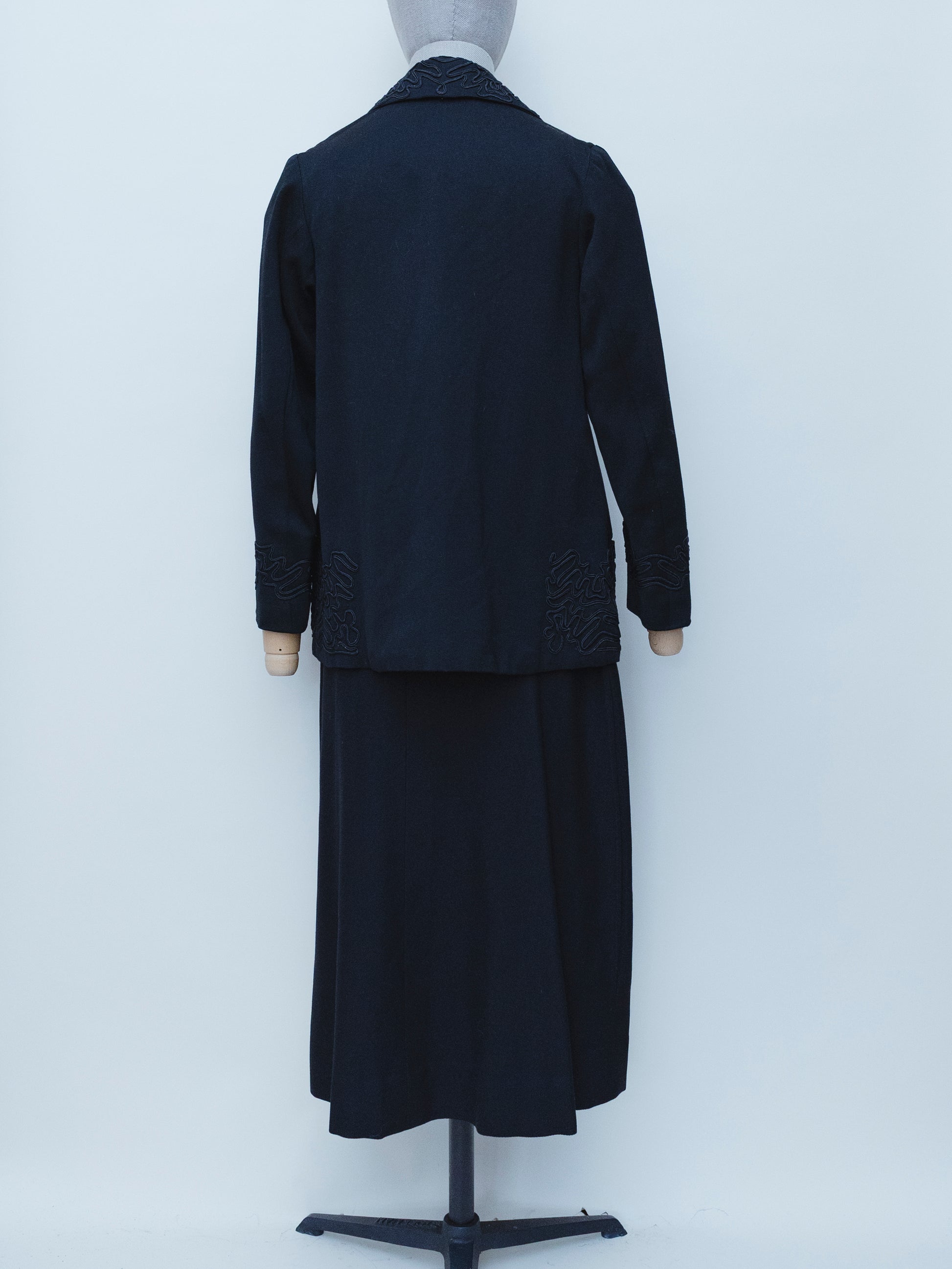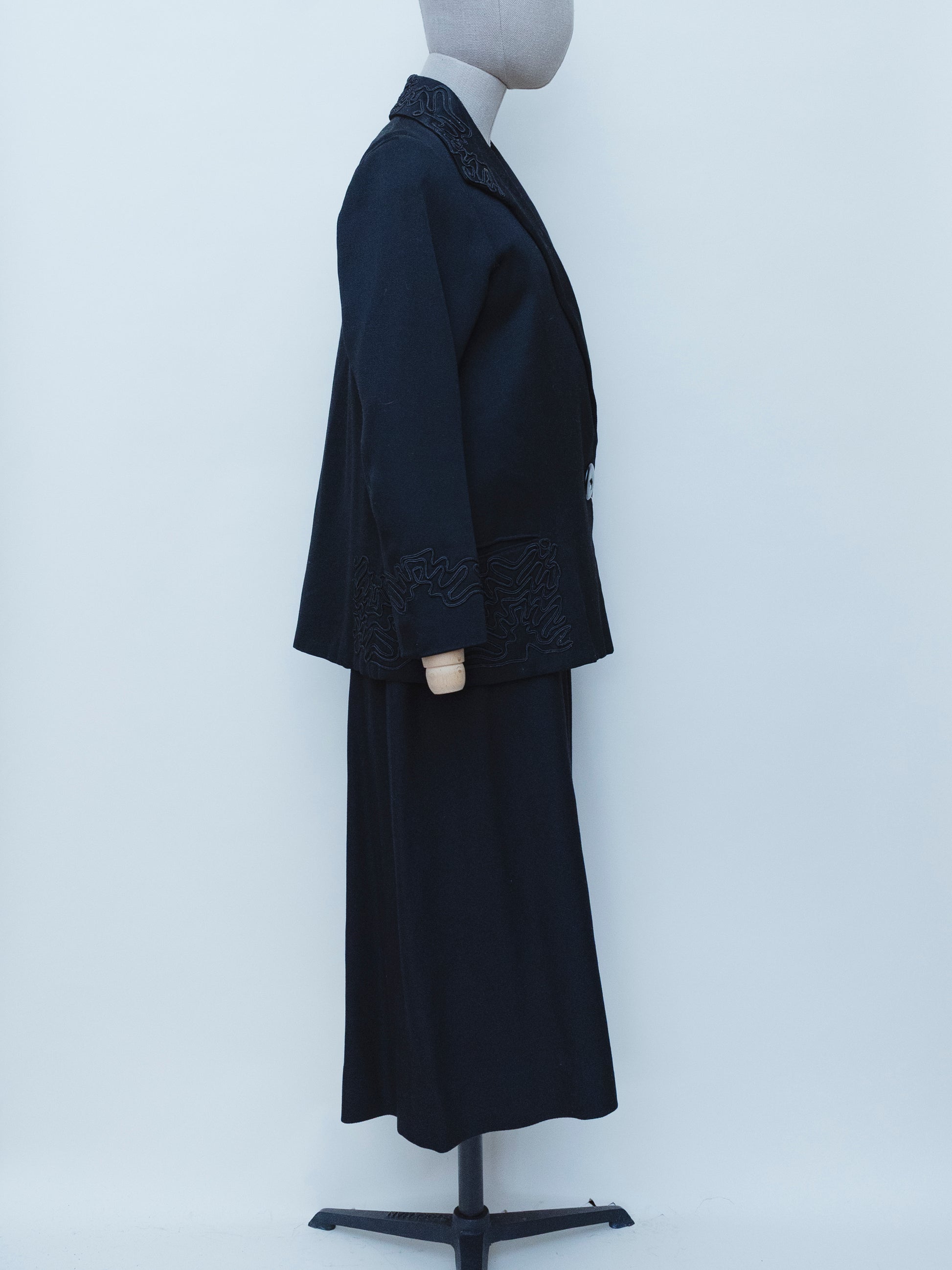 This classic 1920s 2 piece suit features a relaxed, loose silhouette that would pair perfectly with a cloche hat, pearl necklace and Mary Jane heels.