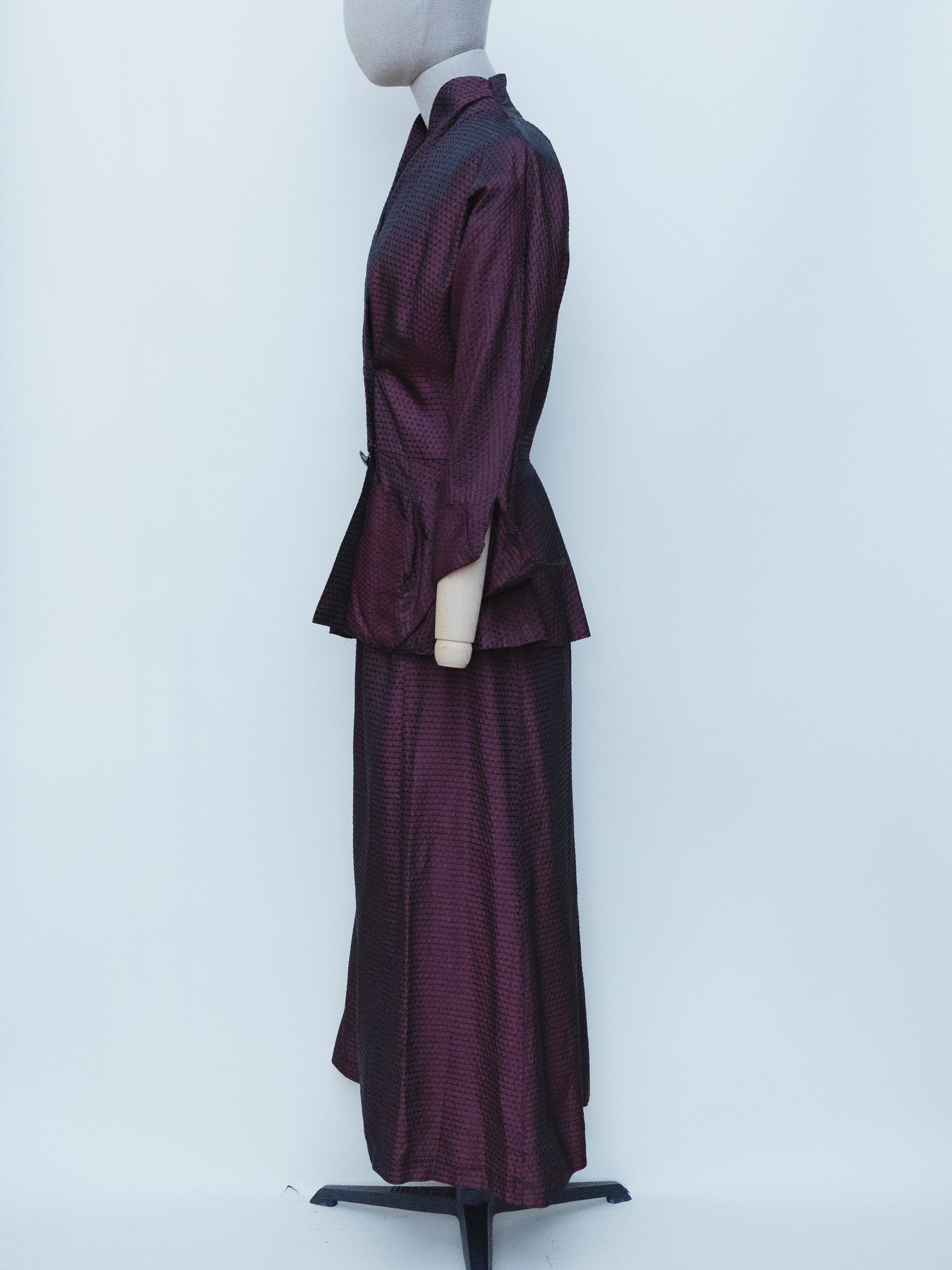 Merlot tonic material, embroidered with textured black line-oval-line pattern. Dolman sleeves, peplum waist on jacket, plenty of darting and long skirt. Beautiful, chic and sophisticated.