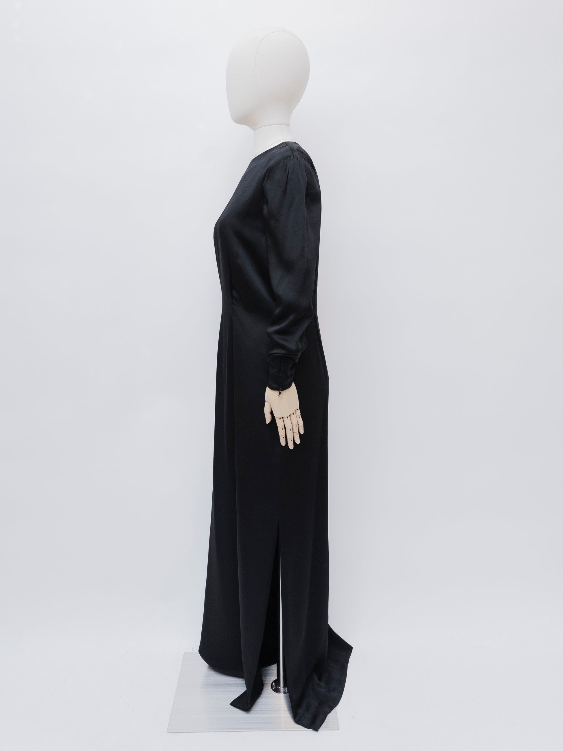 This black, silk gown has zippered cuffs, ruched shoulders and a side slit. There are some small pulls on the front right side of the gown. The price is reflective of this. Dress is unlined.