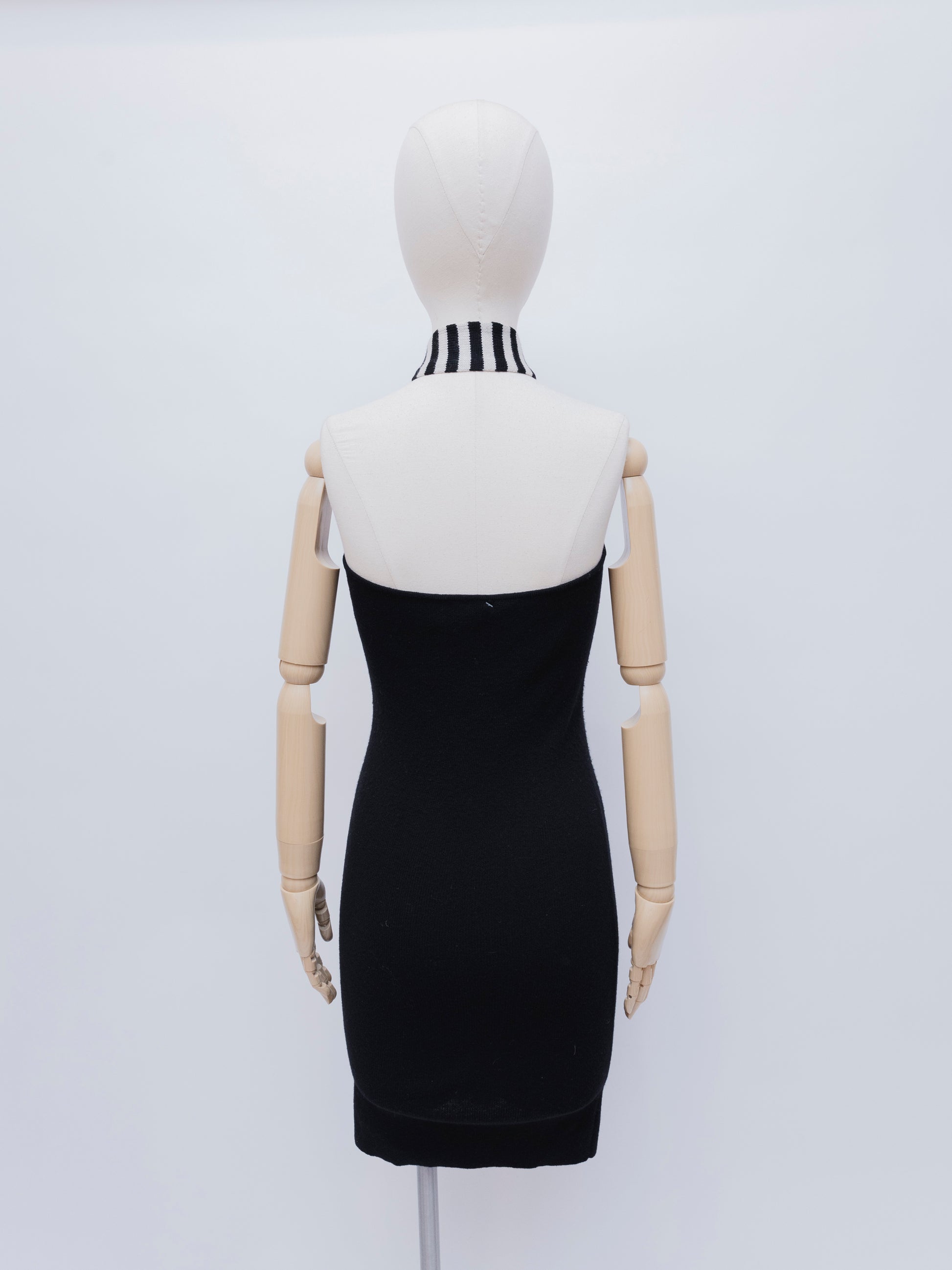 This black, knit, tube dress has a sewn in, striped necktie. Wear as a dress or as a tunic over pants... wear with a white oxford shirt underneath, or with a sheer long sleeved top, or with a tank top. The combinations are endless.