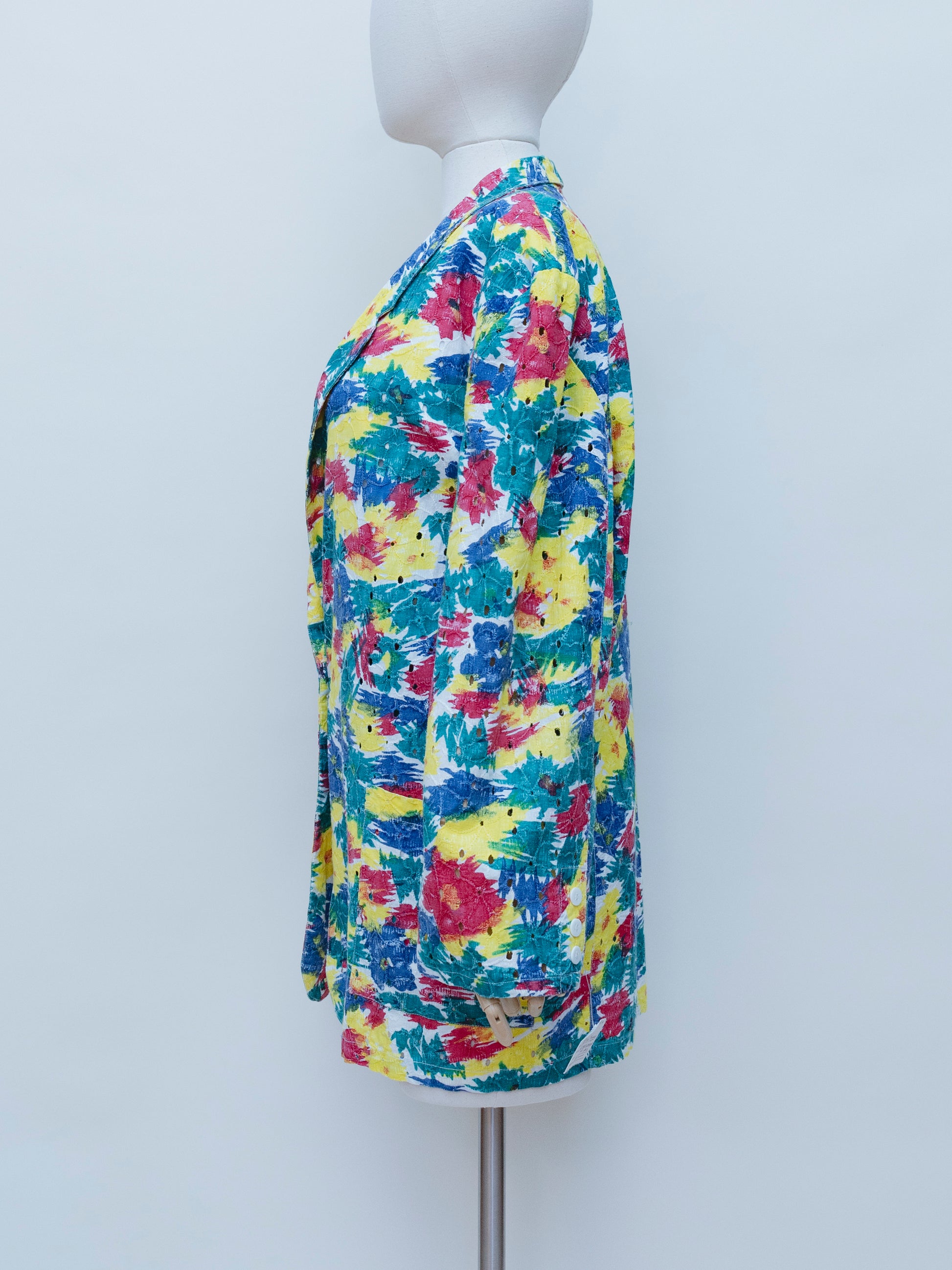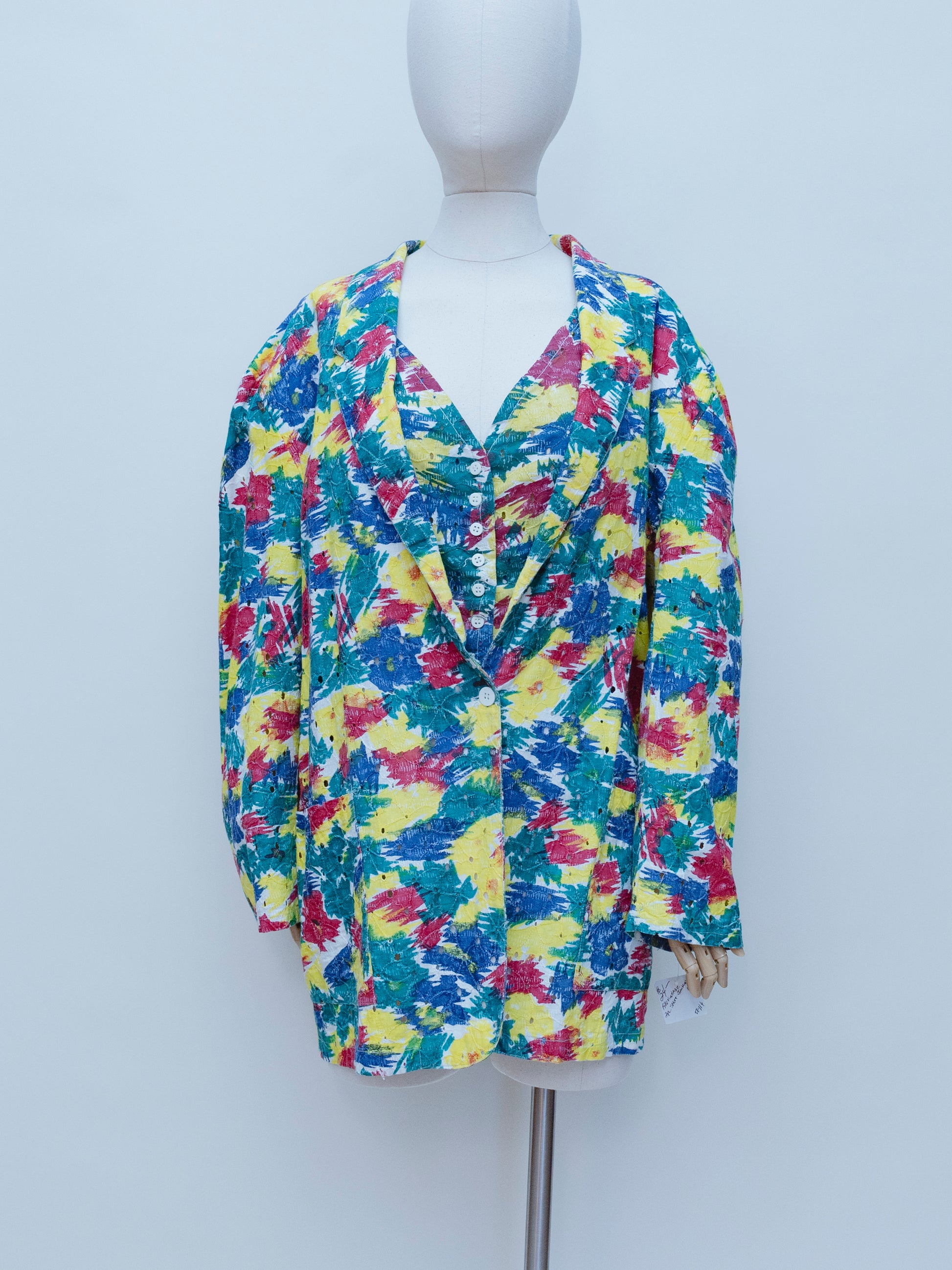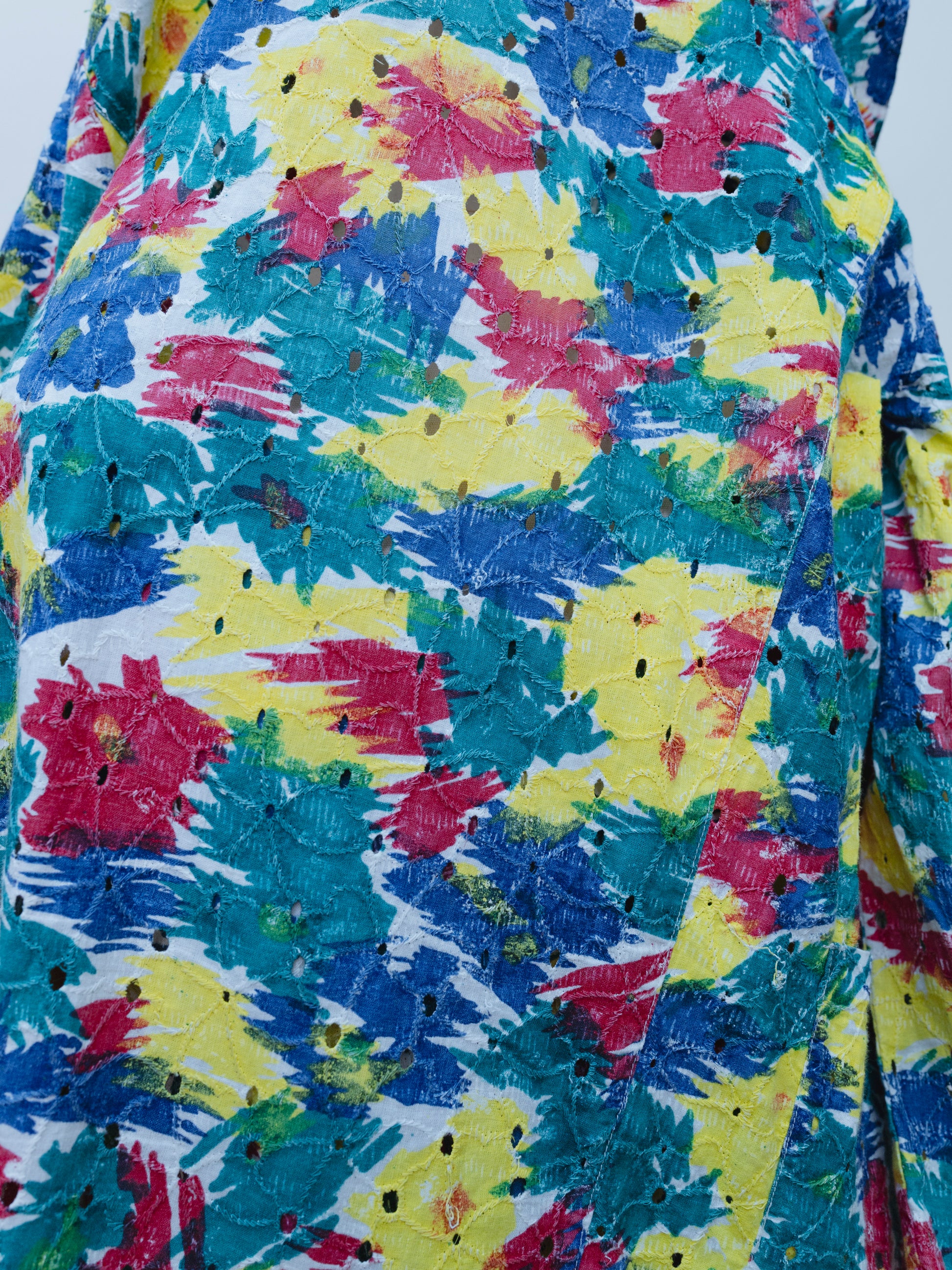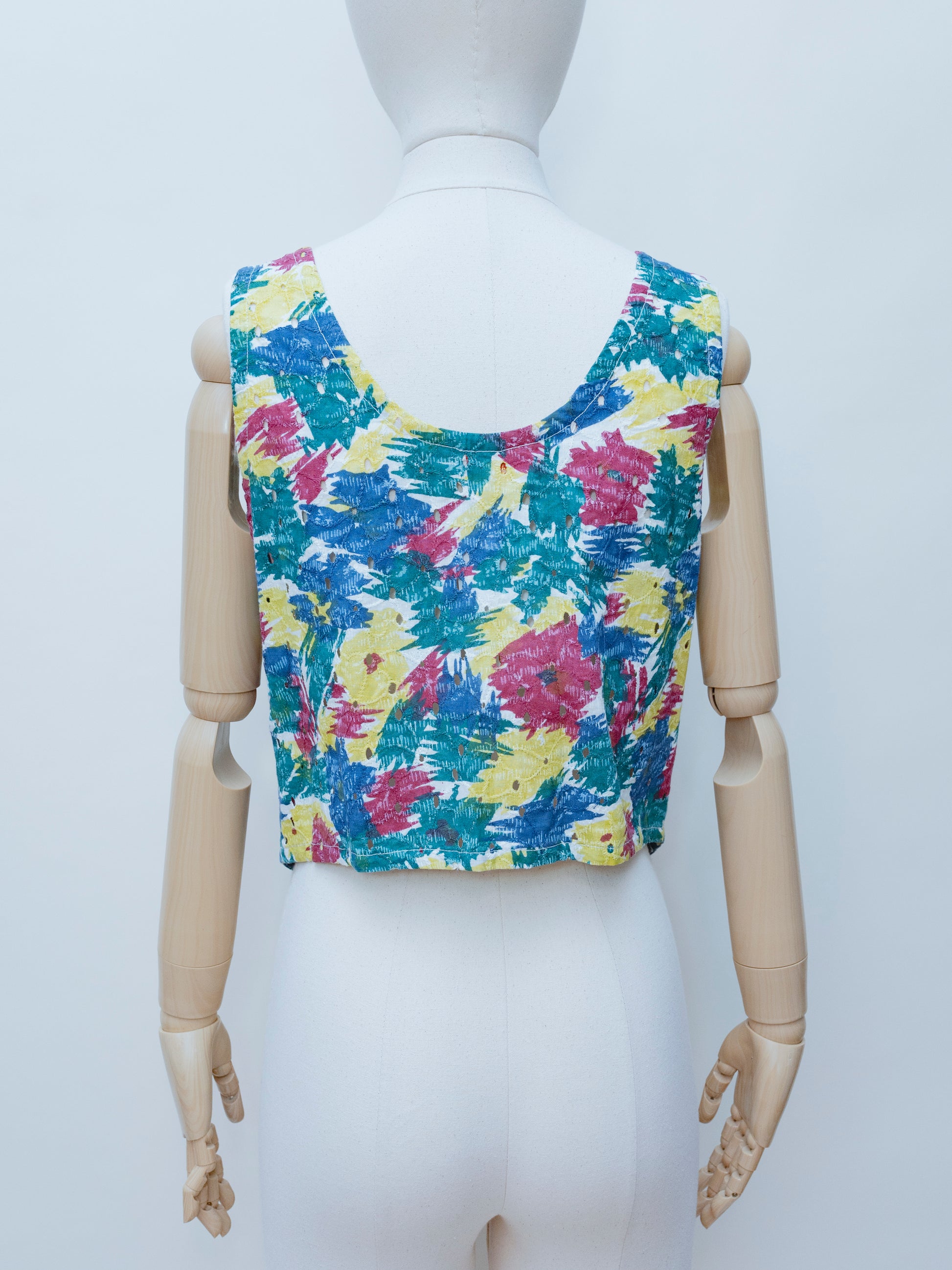 This cotton floral set has fabric that is embroidered with stitching though out and little cutouts. A modern take on eyelet lace. Pieces can be separate or paired together. NOTE *vest front bottom can be tied (like a bandana) for a cropped top style.