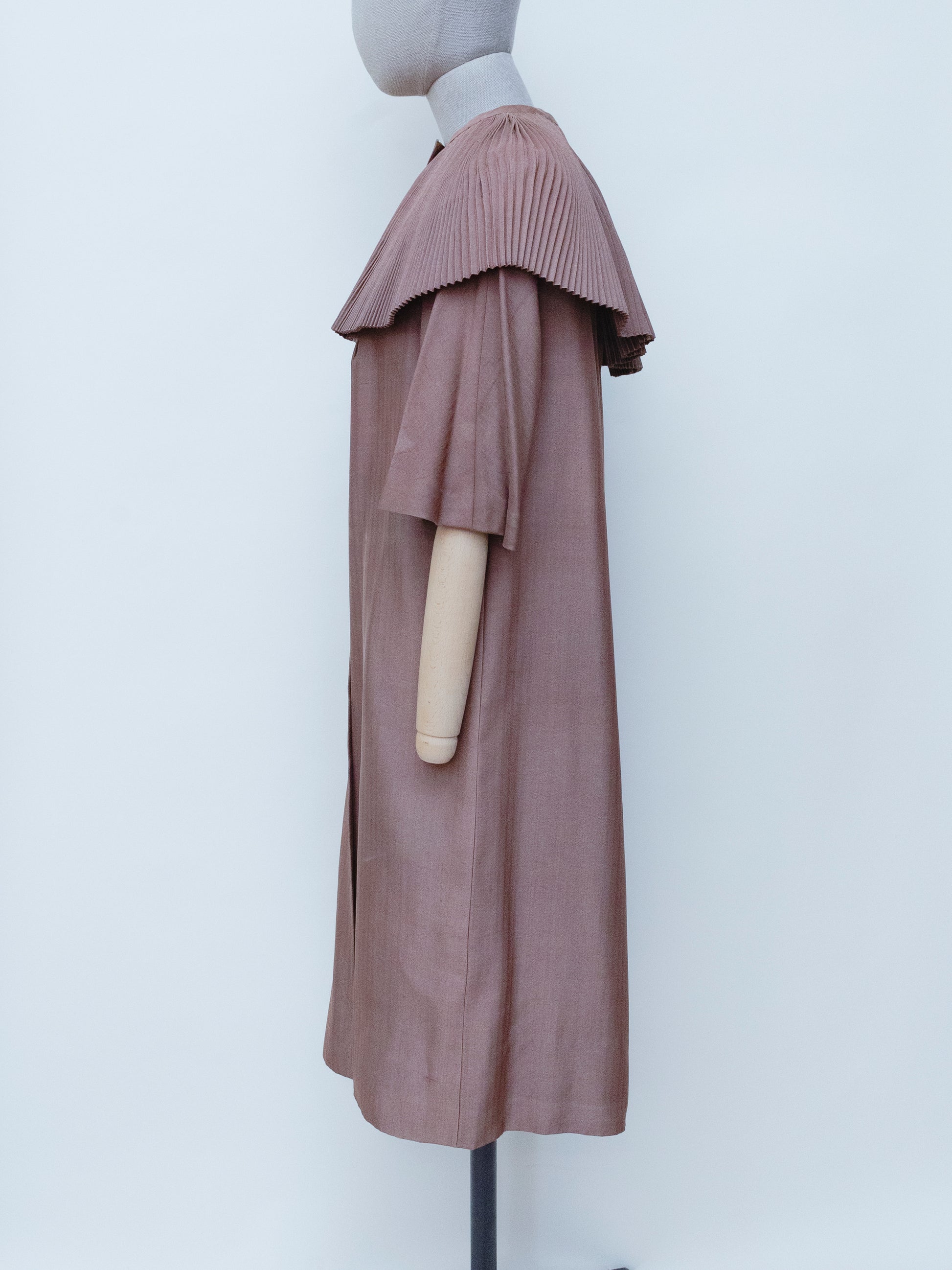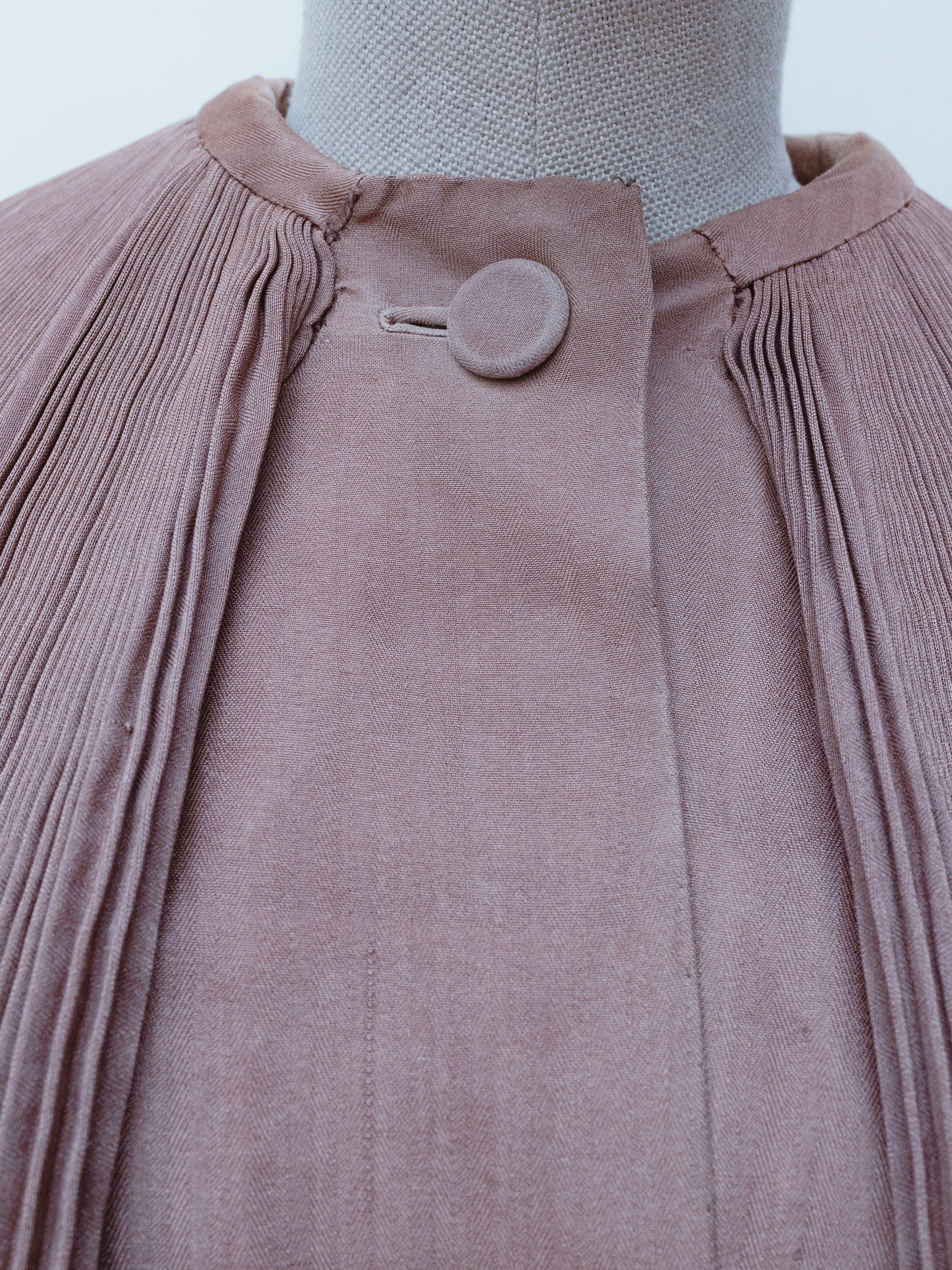 This coat is beautifully made. Envelope button holes, accordion pleated shaw collar and copper color - mercerized cotton - herringbone fabric. Capri sleeves would highlight elbow length gloves. Make any day a little extra special, when you wear this coat.