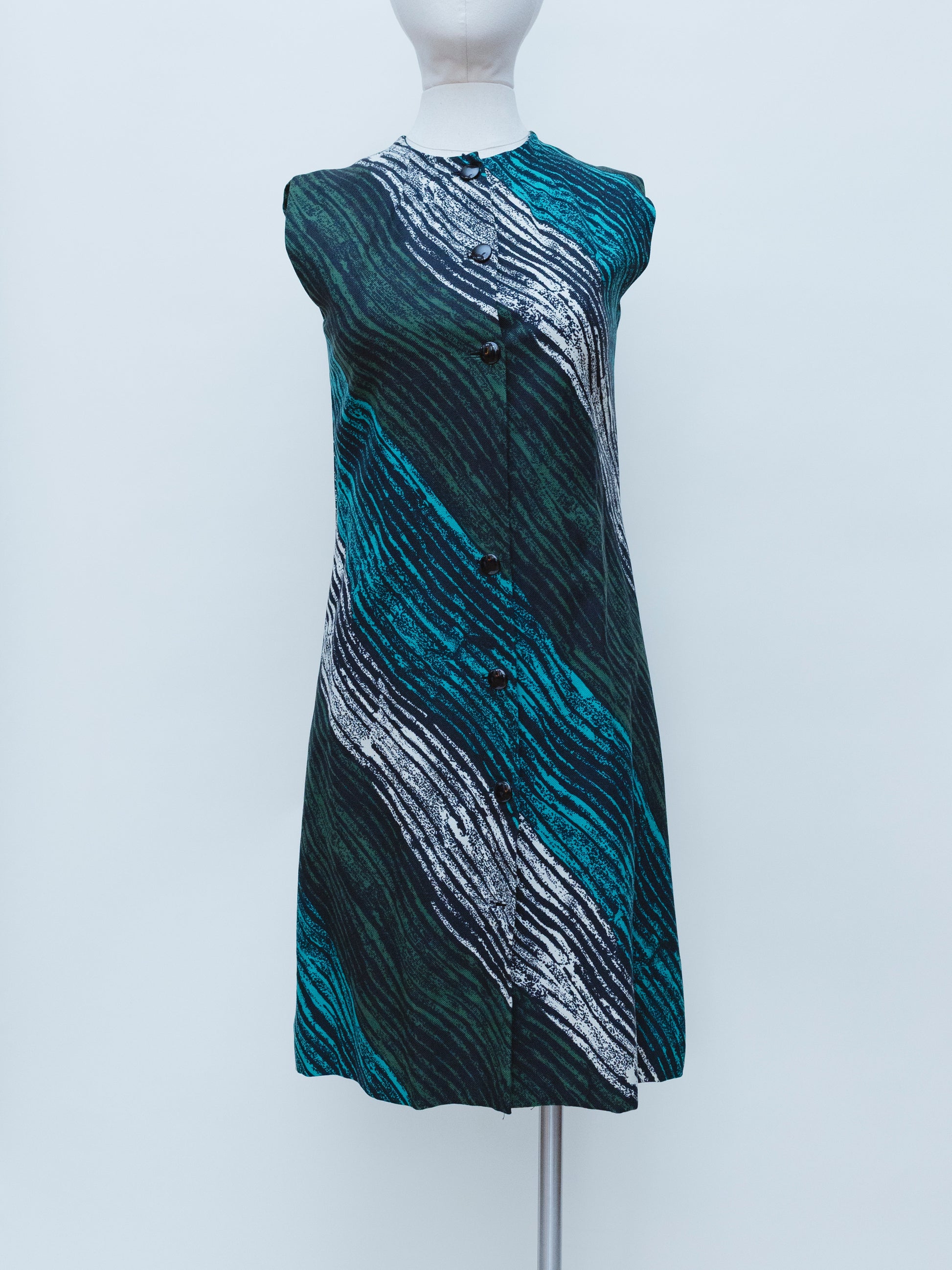 This piece could be worn either as a dress or a long vest. It's lined with black fabric, and has darting around the front neckline to create a smooth shape.