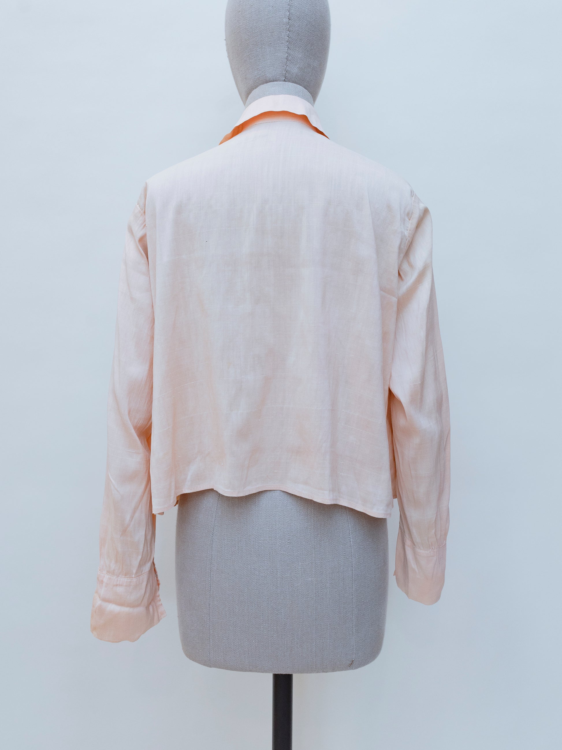 This custom-made blouse in soft blush silk offers understated elegance with a relaxed, feminine shape. The gently gathered shoulders and flowing hemline create ease of movement, while the wide cuffs and open collar add a touch of refinement. Lightweight and graceful, it’s a versatile piece that blends comfort with timeless sophistication.