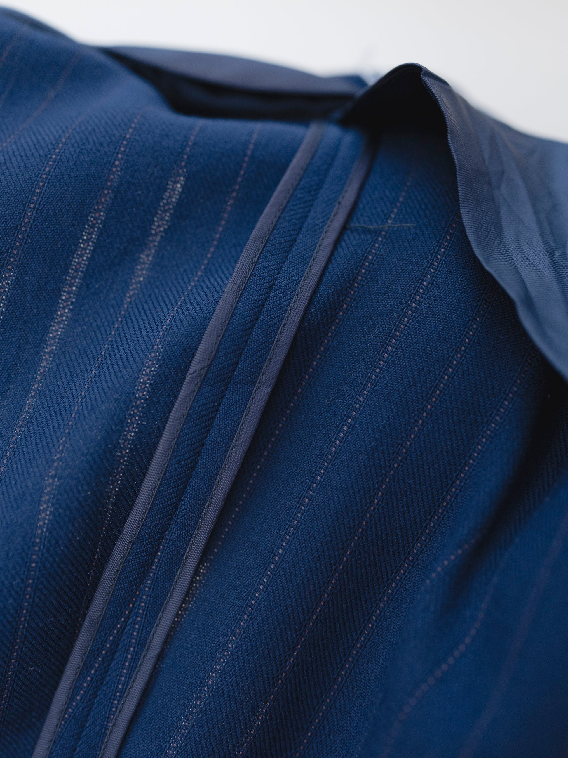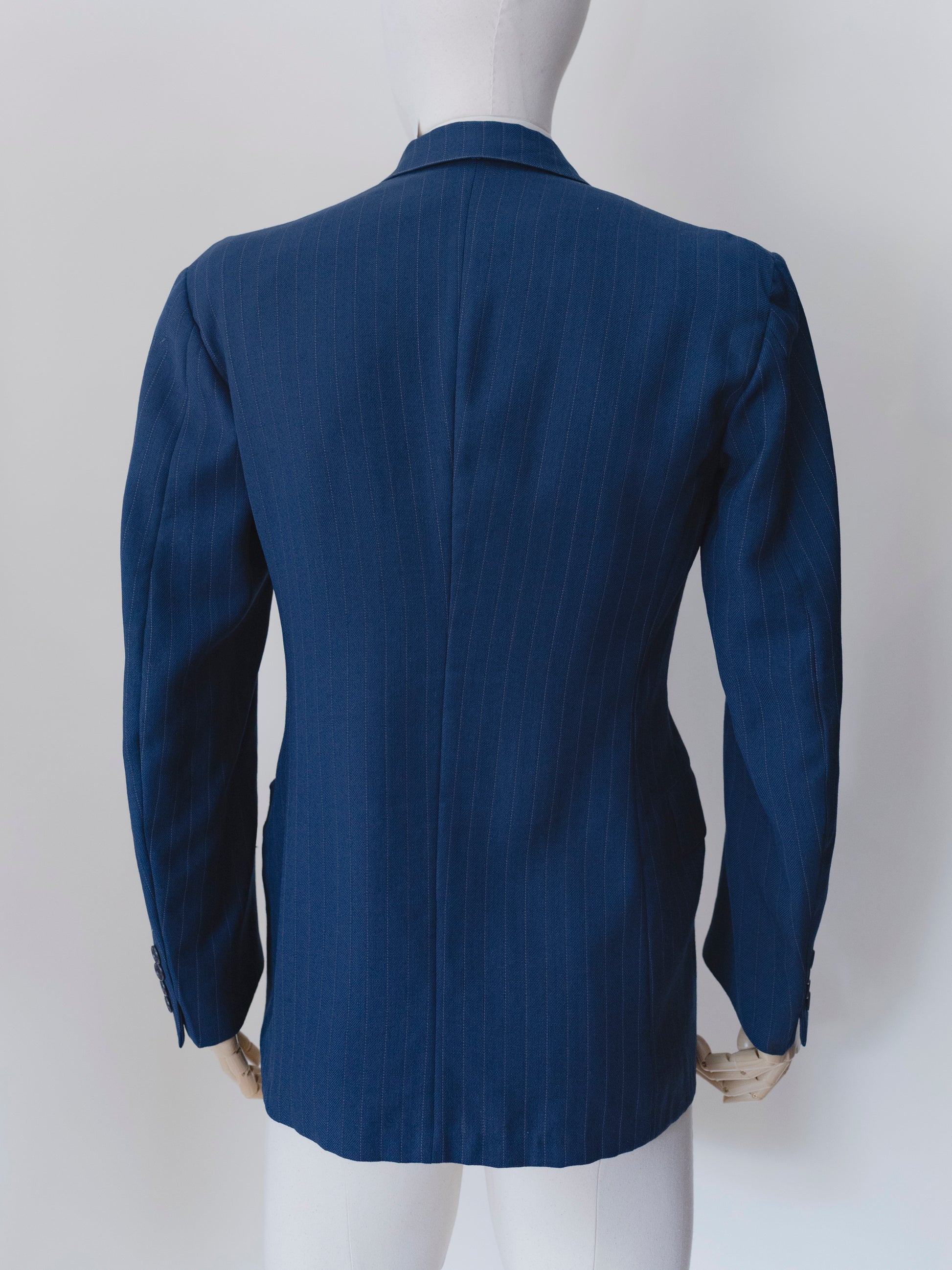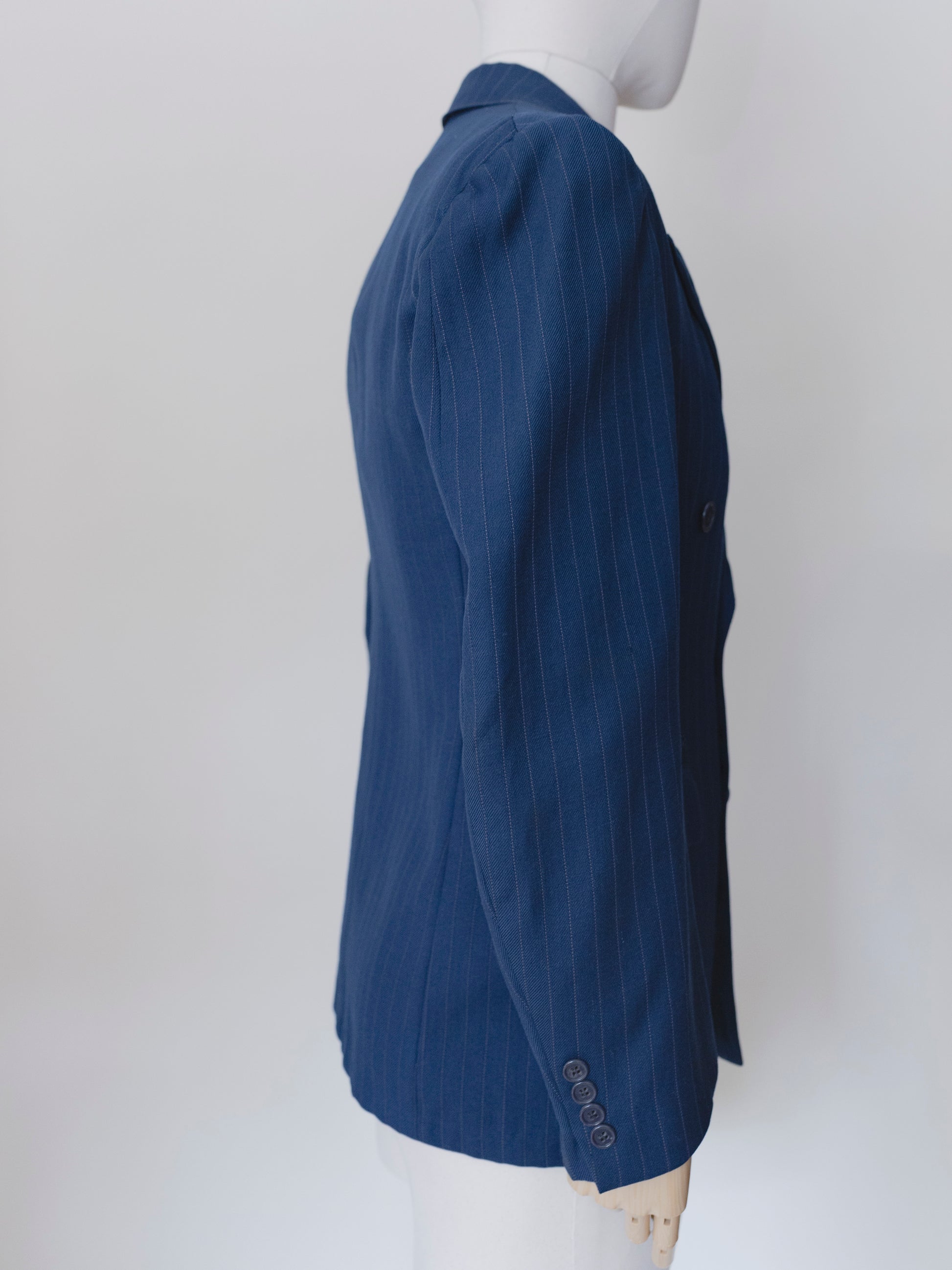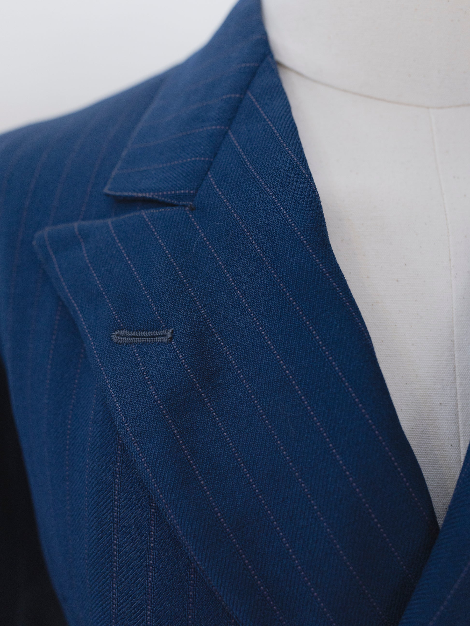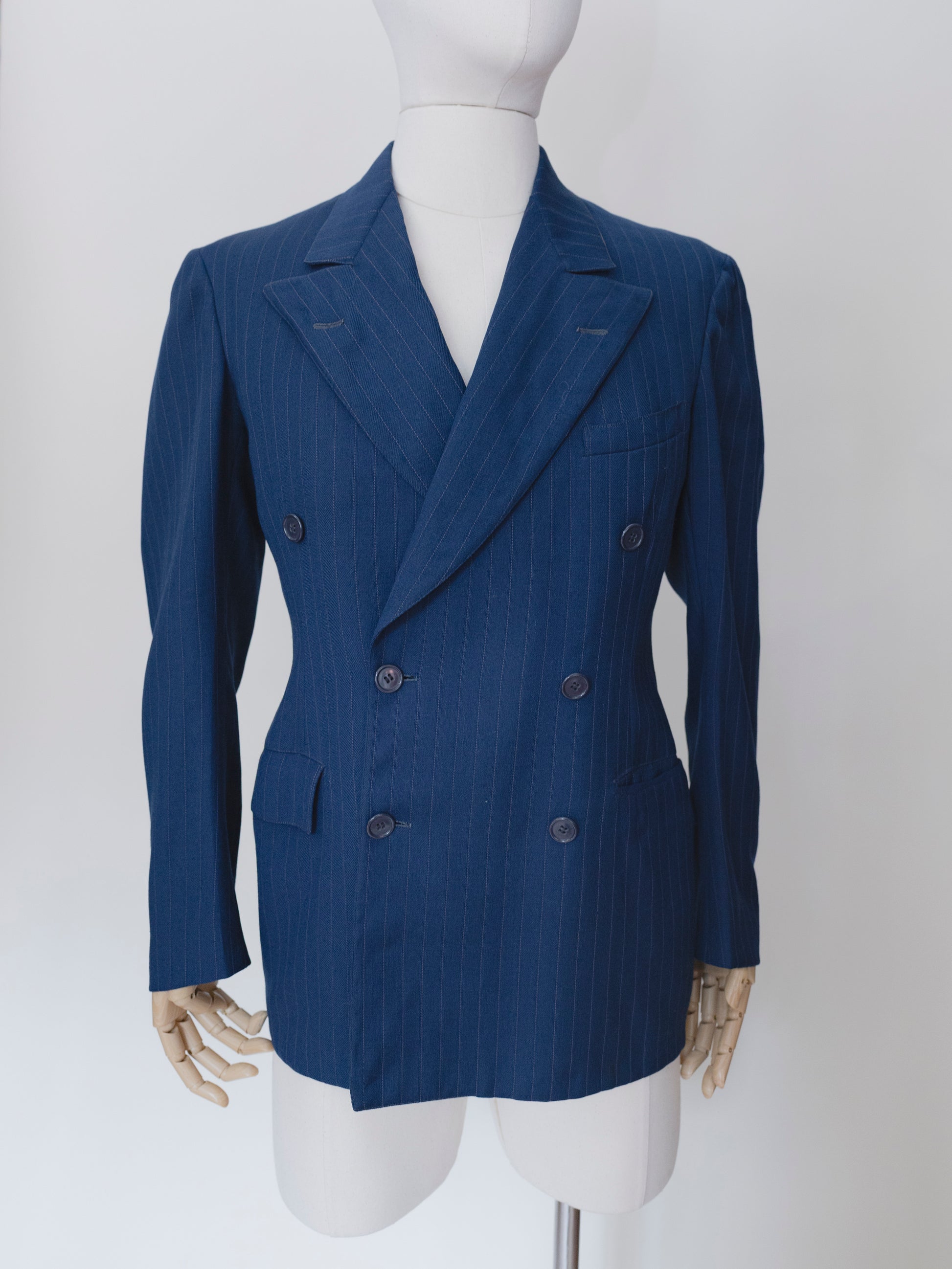 This double breasted pinstripe suit is not only straight out of the 1940s, but the Edwardian revival style uniquely showcases a postwar movement of style. Highly tailored styles boomed as a reaction to the fabric rations brought to the United Kingdom and United States during World War 2. After the war, craftsmanship and tailoring were in, and nothing represents this better than this masterfully tailored jacket. The lack of a label suggests that this may be a custom piece.