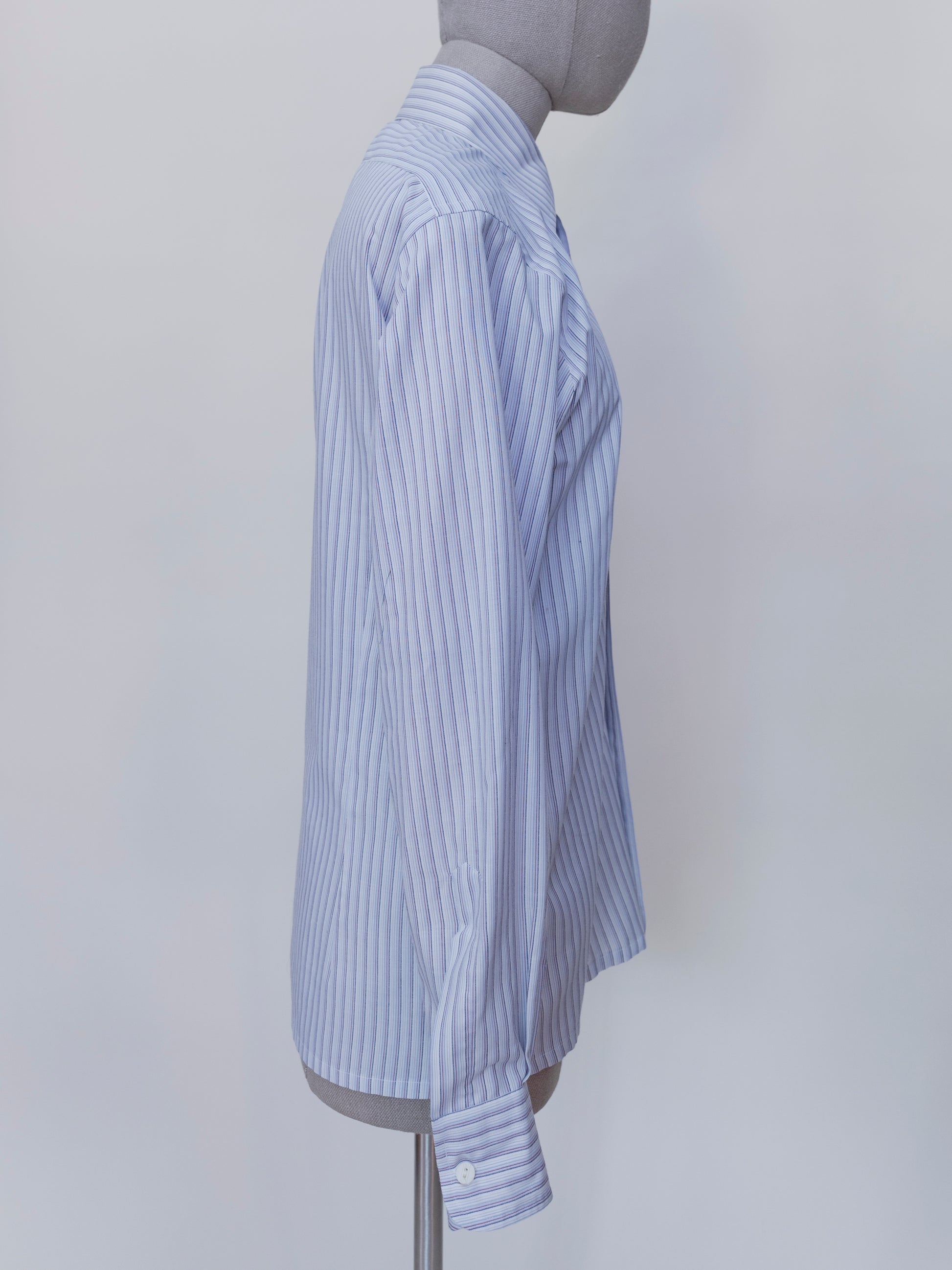 This classic 1970's style has blue, burgundy and black stripe on white shirt.