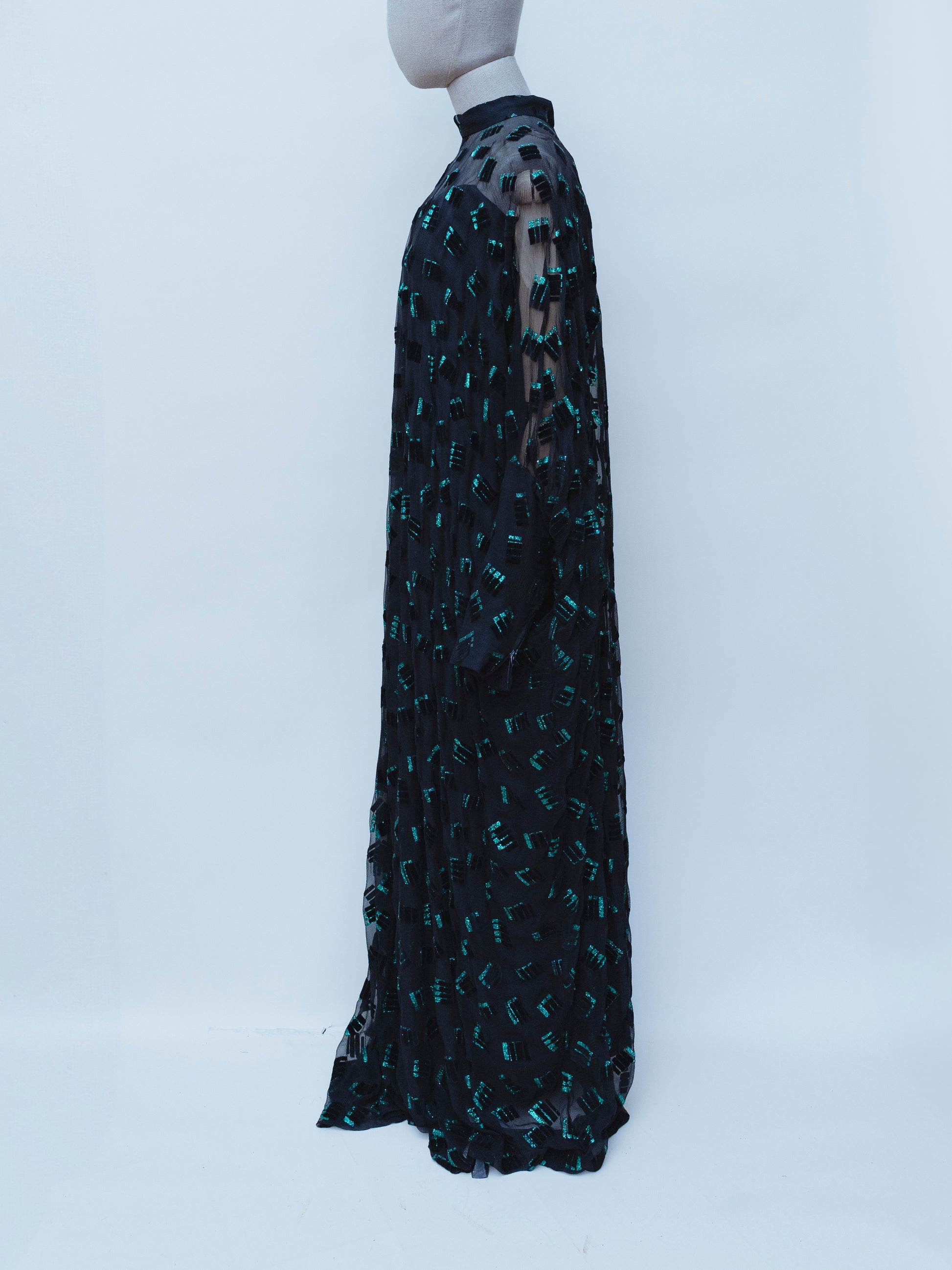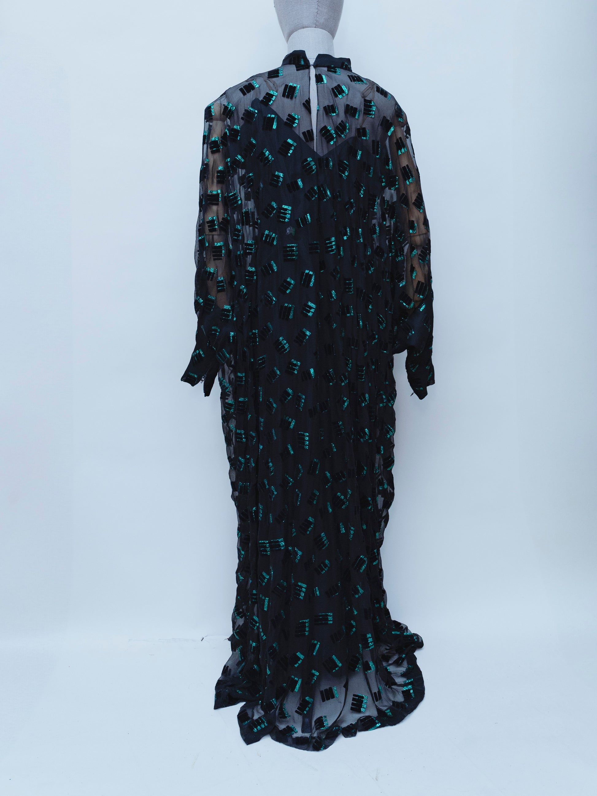 This Pauline Trigere piece is elegant and beautifully constructed. The mesh outer piece drapes over the silk slip in a stunning silhouette, making the vintage piece harken back to the fashion of Cass Elliott and others.