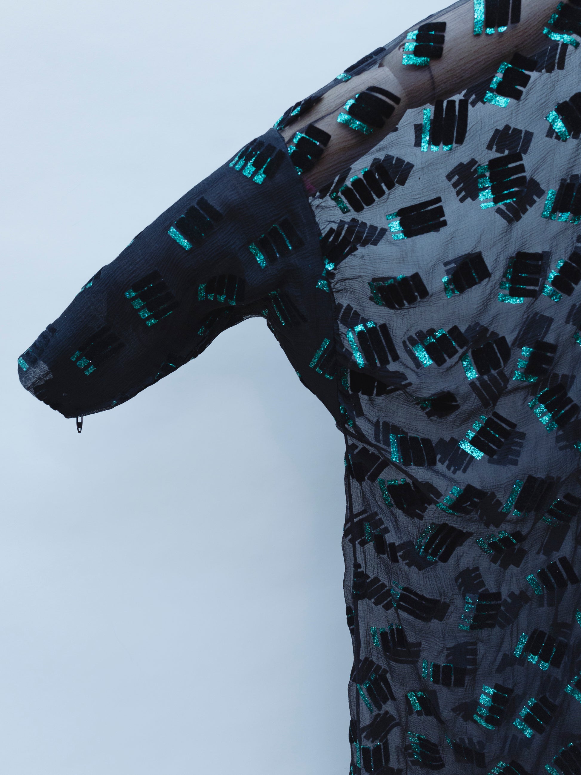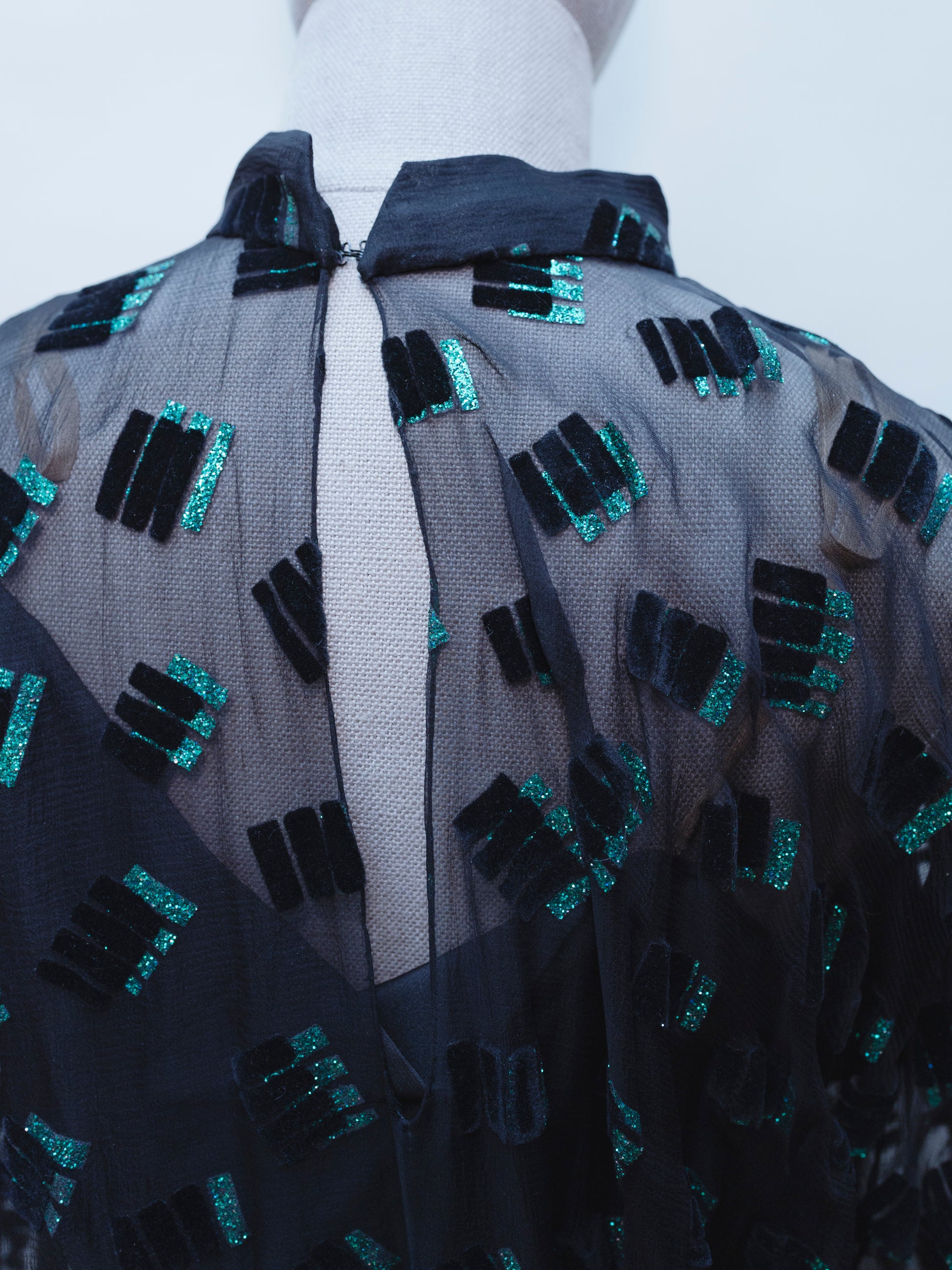 There are 2 pieces to this set; a black silk slip and a sheer silk outer dress. The pieces are completely detached and can be worn together or separately.